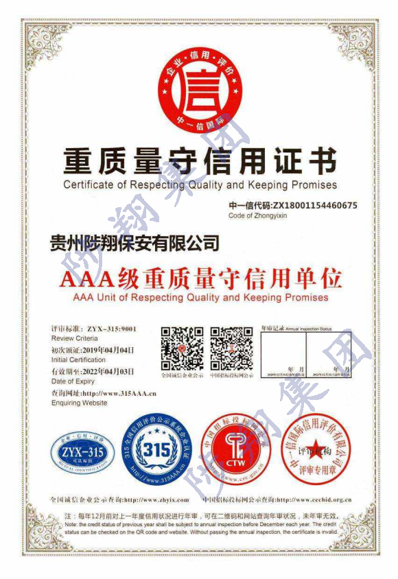 重質量守信用證書